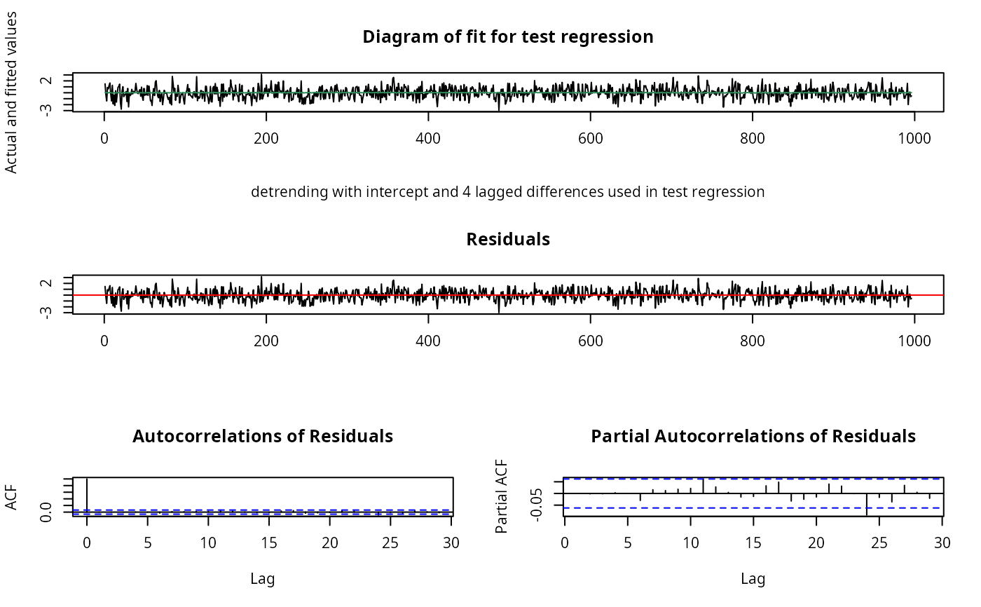 urdfTest(x, lags = 1, type = c("nc", "c", "ct"), doplot = TRUE)